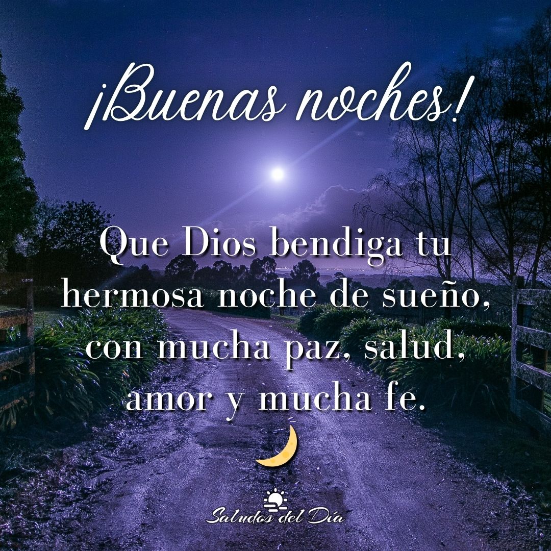 Buenas noches Buenas noches Que Dios bendiga tu hermosa noche de sueño, con mucha paz, salud, amor y mucha fe. ¡Buenas noches! 🌙 Comparte este mensaje Anterior Noche bendecida por Dios Siguiente Buenas noches