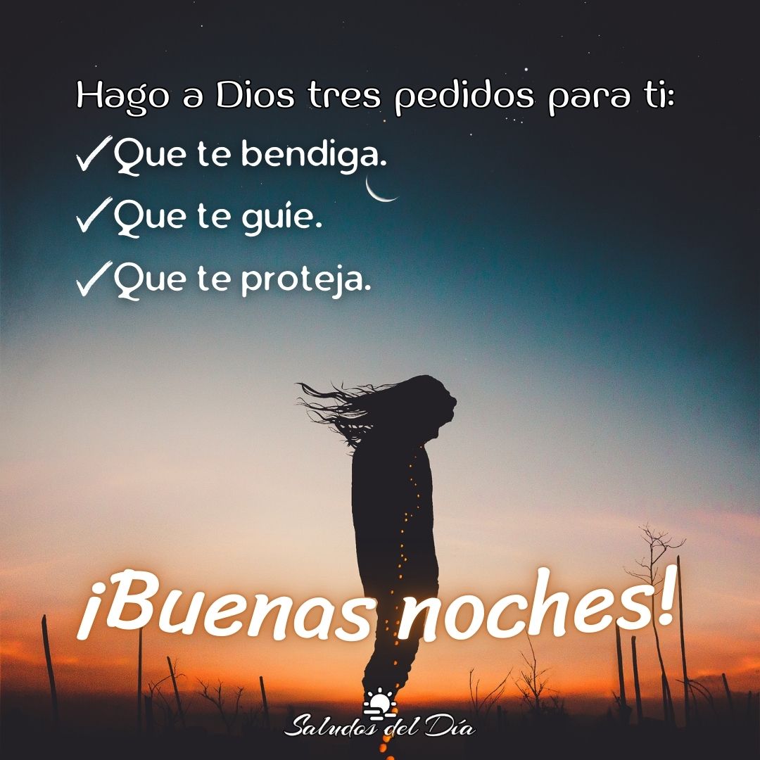 Buenas noches Buenas noches Hago a Dios tres pedidos para ti:Que te bendiga.Que te guíe.Que te proteja. 🙏 ¡Buenas noches! Comparte este mensaje Anterior Buenas noches Siguiente Buenas tardes