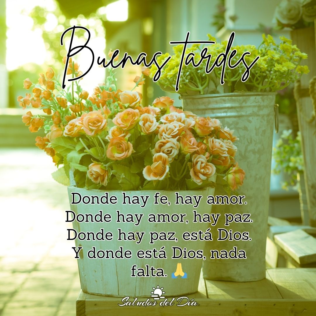 Buenas tardes Buenas tardes ¡Buenas tardes! Donde hay fe, hay amor.Donde hay amor, hay paz.Donde hay paz, está Dios.Y donde está Dios, nada falta. 🙏 Comparte este mensaje Anterior Que este mes sea bendecido Siguiente Buenas tardes