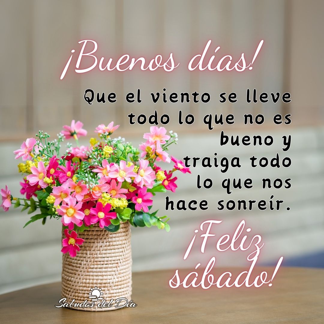 Buenos días y feliz sábado Buenos días, Sábado ¡Buenos días! Que el viento se lleve todo lo que no es bueno y traiga todo lo que nos hace sonreír. ¡Feliz sábado! Comparte este mensaje Anterior Maravilloso domingo Siguiente Buenos días y feliz viernes