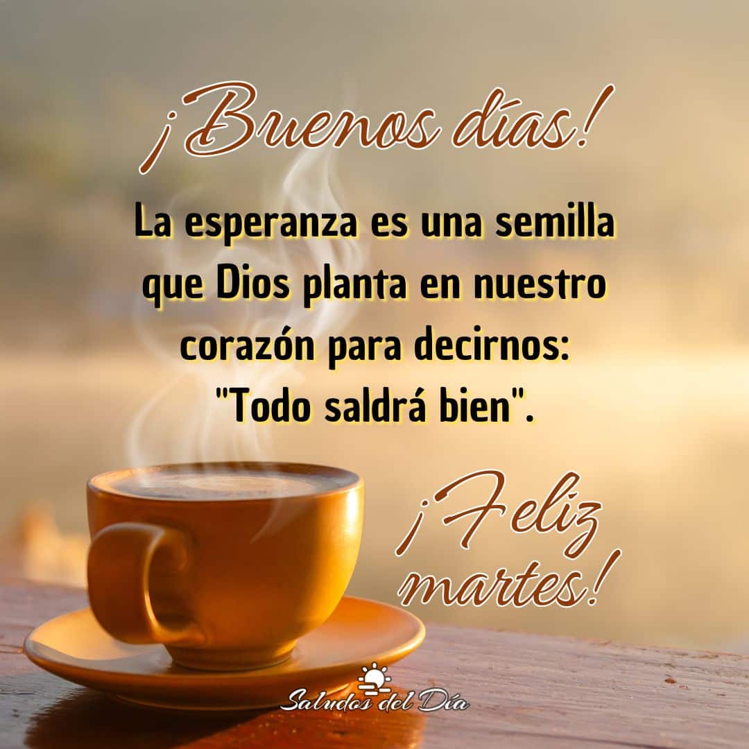 Feliz martes Buenos días, Martes ¡Buenos días! La esperanza es una semilla que Dios planta en nuestro corazón para decirnos:«Todo saldrá bien«. ¡Feliz martes! 🌱 Comparte este mensaje Anterior Buenos días y feliz sábado Siguiente Buenos días jueves