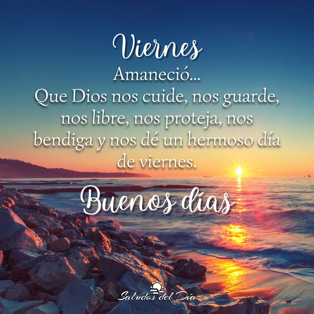 Buenos días de viernes Buenos días, Viernes Viernes Amaneció…Que Dios nos cuide, nos guarde, nos libre, nos proteja, nos bendiga y nos dé un hermoso día de viernes. ¡Buenos días! ☀️ Comparte este mensaje Anterior Buenos días de domingo Siguiente Buenos días y feliz jueves