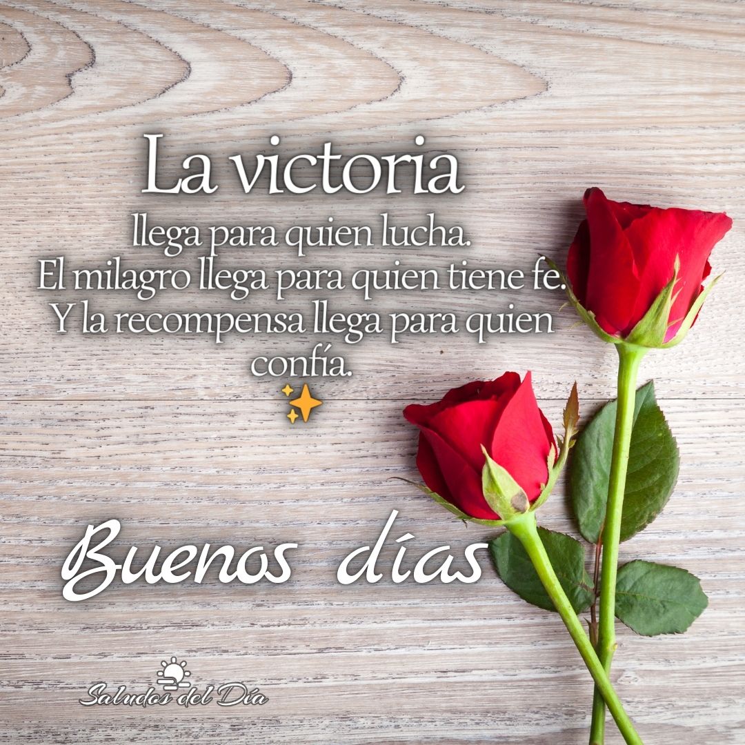 Buenos días Buenos días La victoria llega para quien lucha.El milagro llega para quien tiene fe.Y la recompensa llega para quien confía. ✨ ¡Buenos días! Comparte este mensaje Anterior Buenos días Siguiente Buenas tardes