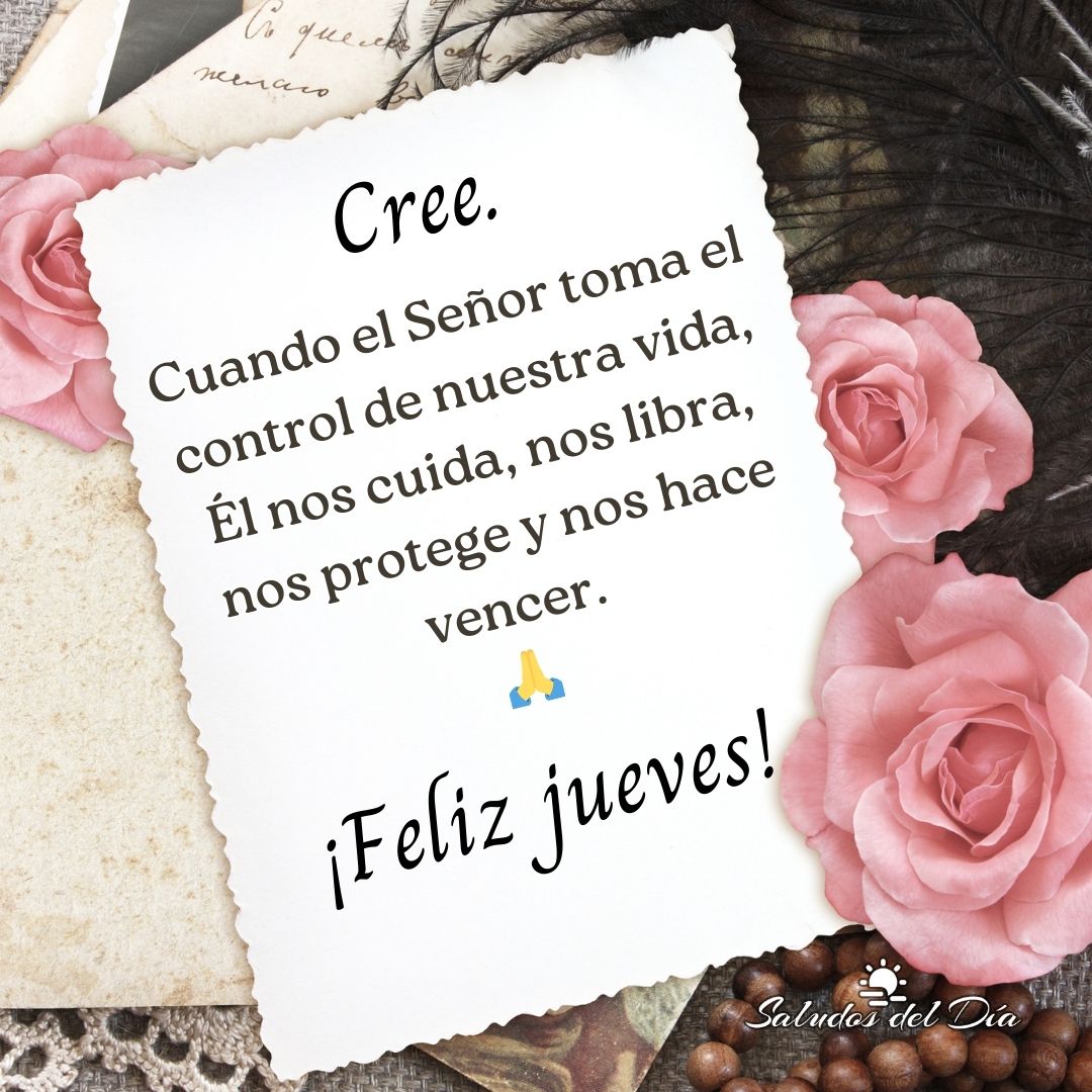 Feliz jueves Jueves Cree.Cuando el Señor toma el control de nuestra vida, Él nos cuida, nos libra, nos protege y nos hace vencer. ¡Feliz jueves! 🙏 Comparte este mensaje Anterior Feliz jueves Siguiente Feliz jueves